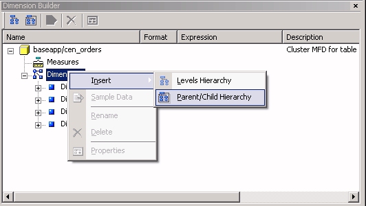 2. Right-click the dimension and select Parent/Child Hierarchy from the Insert submenu.