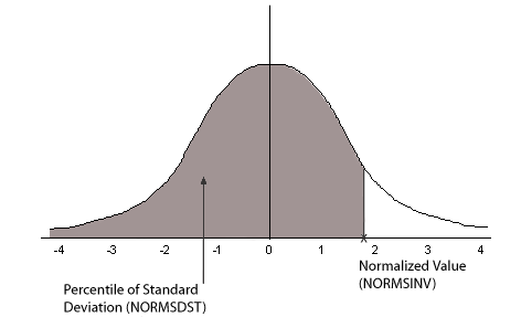 The following diagram illustrates the results of the NORMSDST and NORMSINV functions.