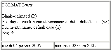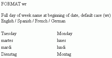 wr | Includes a full day of the week name at the start of the displayed date. The name displays in the default case of the specified language (for example, all lowercase for French and Spanish, initial uppercase for English and German). |