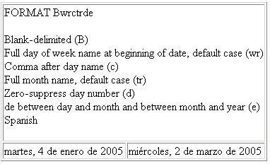 The following request prints a blank delimited date in Spanish with a full day name at the beginning in lowercase (the default for Spanish) followed by a comma, and with the word de between the day number and month and between the month and year: