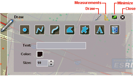 The Draw dialog allows you to draw points, lines, shapes, and enter text directly on the map. You can also specify the color and size of the graphic or text.