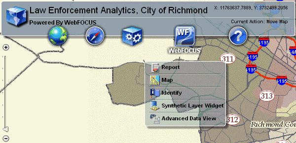 In the following example, Identify was first selected from the Tools component. Then, a point on the map from the Arrest layer (indicated by red points) was selected. When the information from the WebFOCUS Reporting Server is received, a callout is displayed on the map with detailed information about the crime (type of offense, location, and so on).