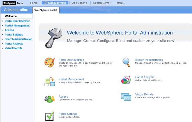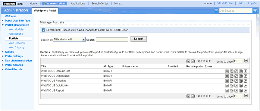 To install the WebFOCUS Portlets on the IBM WebSphere Portal Server, an administrator must have Manage permissions. If Manage permissions on the portal exists, the administrator selects a .war file. Each .war file includes descriptive information about the portlet, which is placed in a database that can be queried by other portal components. During installation, the application server unpacks the .war file and places the portlet classes and resources into a file system.