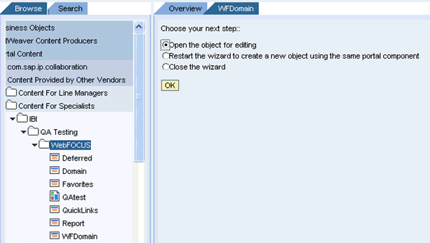 The iView is added and a new tab for the iView, for example, WFDomain, is displayed in the right pane.