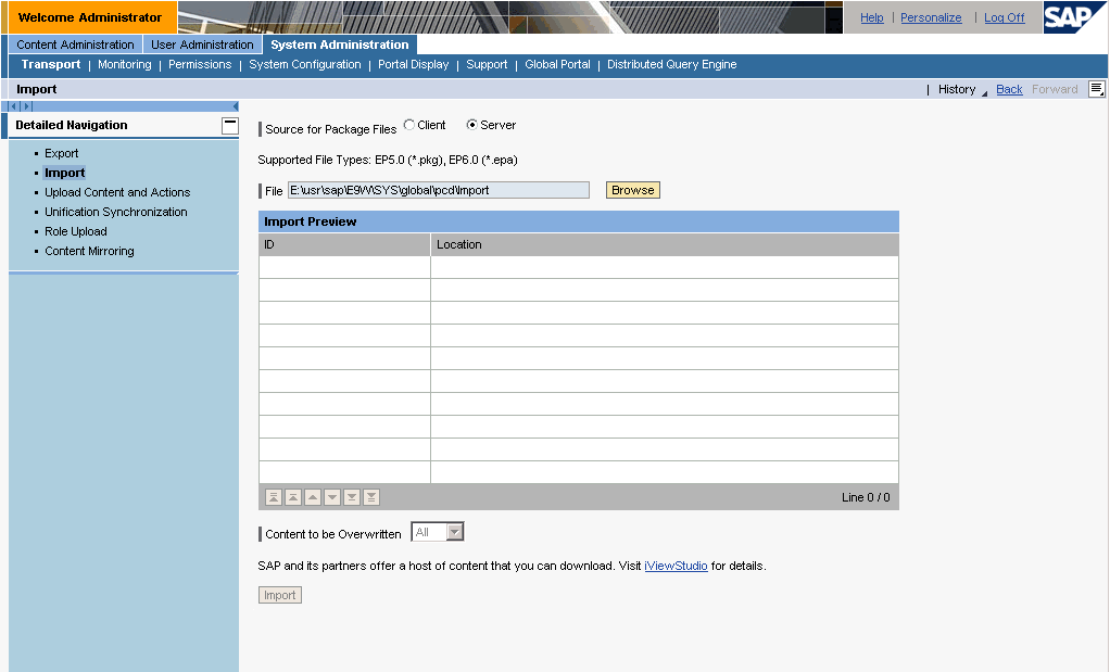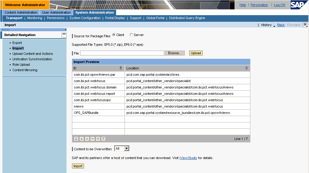 The following section describes how to import the WEBFOCUSOPS.EPA file, which packages the WebFOCUS iViews for the Enterprise Portal. In addition, this file also deploys the com.ibi.pct.opswfiviews.par application on the SAP Enterprise Portal Server.