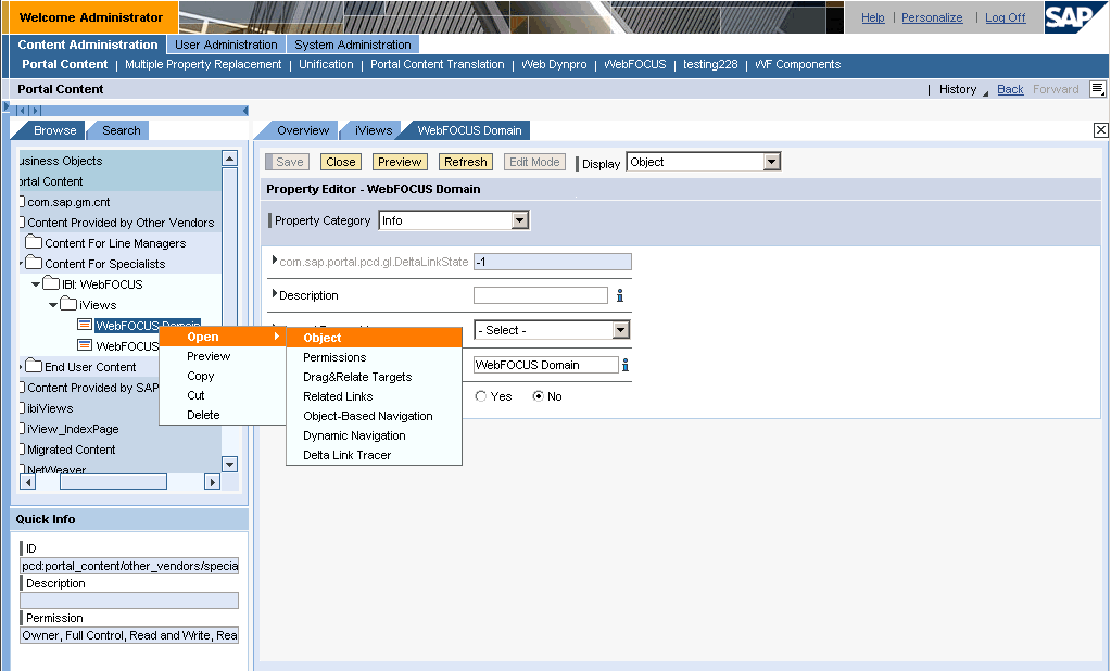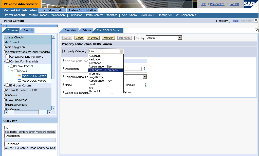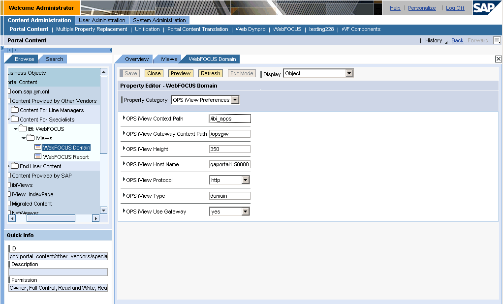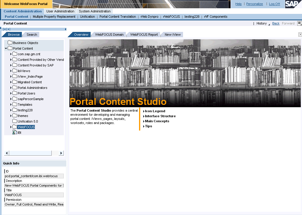 The WebFOCUS iViews allow you to view WebFOCUS business intelligence content within the SAP Enterprise⢠Portal Server environment.