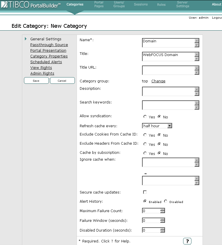 Perform the following steps to add WebFOCUS Categories using the PortalBuilder Administrator Tool.