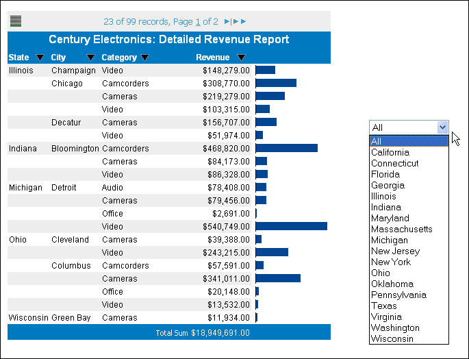 For example, when you select the value West from the first drop-down list, the report is filtered by REGION = West. The second drop-down list, which is populated with values for STATE, dynamically changes to display only the STATE values, CA and WA, for the West REGION. You can now select a STATE value, such as CA, and the report is filtered to display data for STATE = CA within REGION = West.