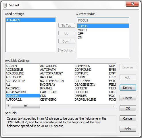 SET ASNAMES = {FOCUS|MIXED|OFF|ON}