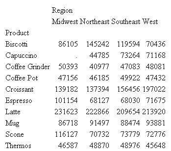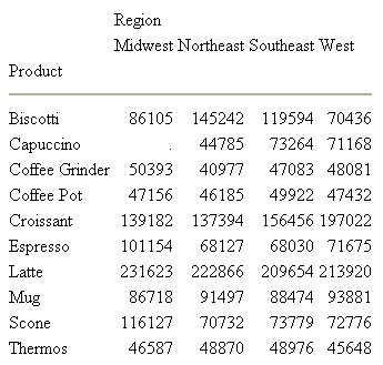 SET TITLELINE=ON TABLE FILE GGSALES SUM UNITS BY PRODUCT ACROSS REGION ON TABLE SET PAGE-NUM OFF ON TABLE SET STYLE * TYPE=REPORT, GRID=OFF, FONT=ARIAL,$ END