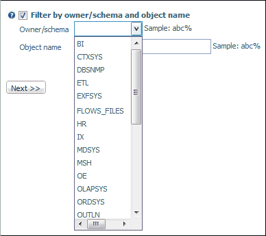 An owner/schema selector for choosing a data source filter is available on the Web Console. It allows you to choose from a list of existing DBMS owners/schemas. This feature is available for Microsoft SQL, DB2, Oracle, and Sybase data sources.