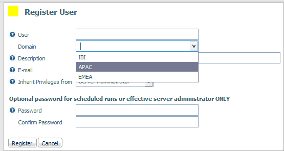 This list of domains is also available from the Register User page. After selecting Workspace, Access Control, right-click a Role and select Register User.
