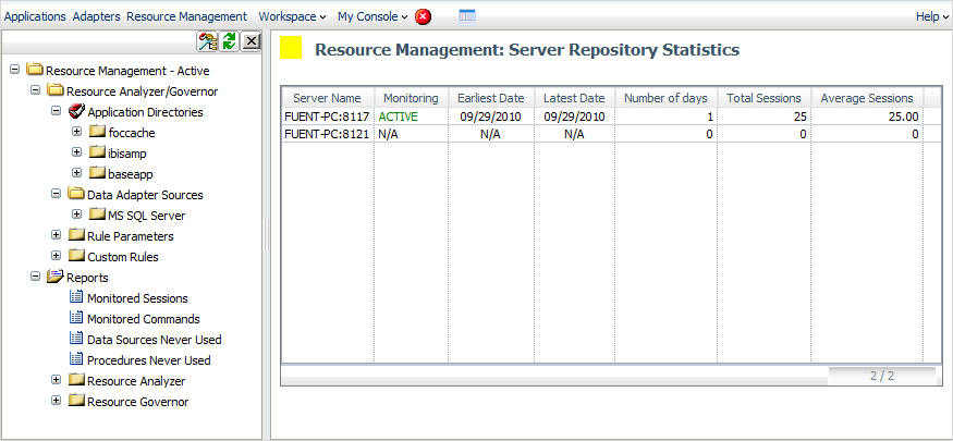 Before Resource Analyzer can monitor request information, it must know your monitoring requirements. You specify these requirements through the Web Console of the server, using the Resource Management Administration Tool. You can specify a range of monitoring configurations depending on your needs. The following image shows sources being monitored from the Web Console of the server.