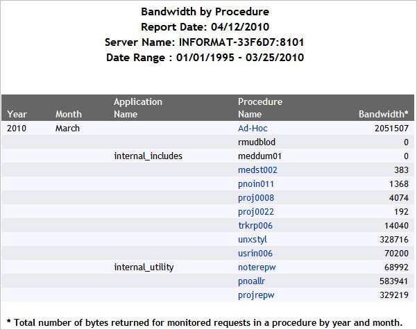 The Bandwidth by Procedure report shows the number of bytes retrieved to the Web server for requests. The report analyzes the bandwidth by database type for each year/month combination. Right-click Bandwidth by Procedure and select Run from the context menu. After specifying report filters, click View Report. The report window opens.