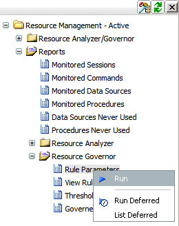 Once you have been monitoring data sources, you can generate reports about the monitored data, rules, and canceled requests. This chapter describes the various reports you can execute using Resource Governor. For all platforms, Resource Governor reporting is accessed from the Web Console.