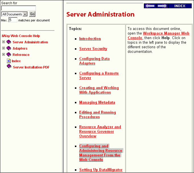The following image shows the Web Console sever page, which displays several available help topics, including two administration topics: Resource Analyzer and Resource Governor Overview and Configuring and Administering Resource Management From the Web Console. The latter topic is selected in this image.