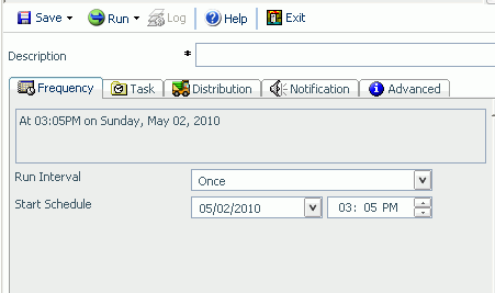 The following image shows the Scheduling tool. It consists of a toolbar with options to Save, Run, or Exit the schedule, a field to provide description of the report that you are scheduling, and a series of tabs from which you access the schedule options.