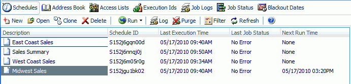 The following image shows the new cloned schedule in the Schedules window. Note that the cloned schedule is disabled by default, as specified in the Next Run Time column.