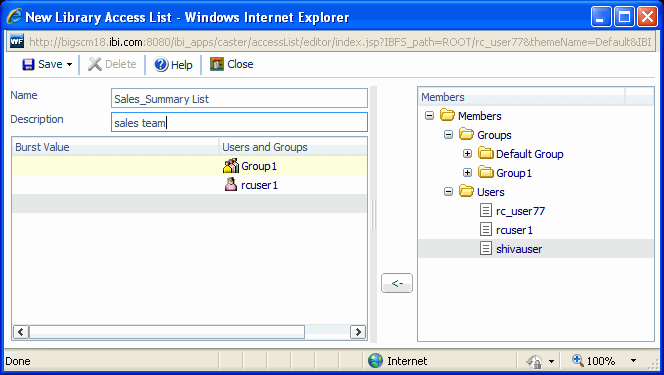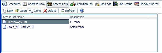 An Access List defines the users and groups that are allowed to view the output of specified schedules distributed to the Report Library. After the Access List is created, it can be used as often as needed. Each Access List is created as a private list that is known only by ReportCaster Administrators and the user who created it.
