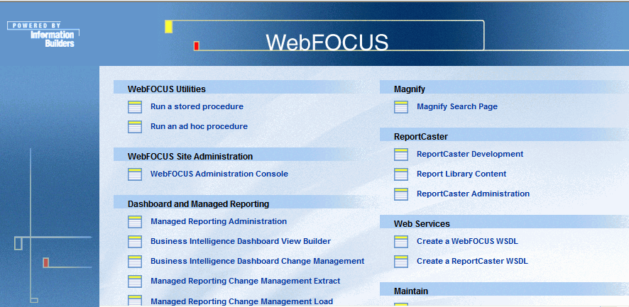 ReportCaster provides a Development Interface, an Administration Interface, and the Report Library. You can access these from the WebFOCUS Welcome Page, under the ReportCaster section, as shown in the following image.