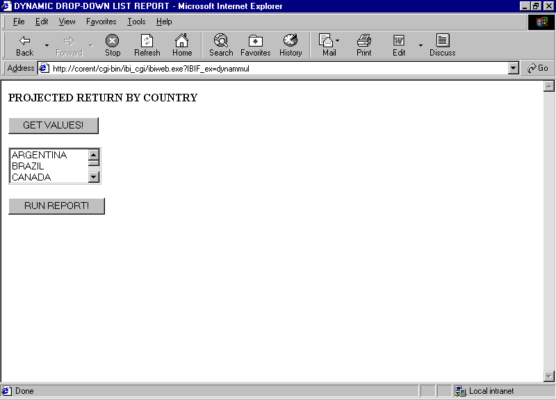 <HTML> <TITLE> DYNAMIC DROP-DOWN LIST REPORT </TITLE> <H4> PROJECTED RETURN BY COUNTRY </H4> <FORM ACTION="/ibi_apps/WFServlet" METHOD="GET"> <INPUT TYPE="HIDDEN" NAME="IBIF_ex" VALUE="MULRPT"> <SELECT NAME="COUNTRY" SIZE="3" MULTIPLE> <!--WEBFOCUS TABLE DYNAMLST--> </SELECT> <BR><BR><INPUT TYPE="SUBMIT" VALUE="RUN REPORT!"></FORM> </BODY> </HTML>