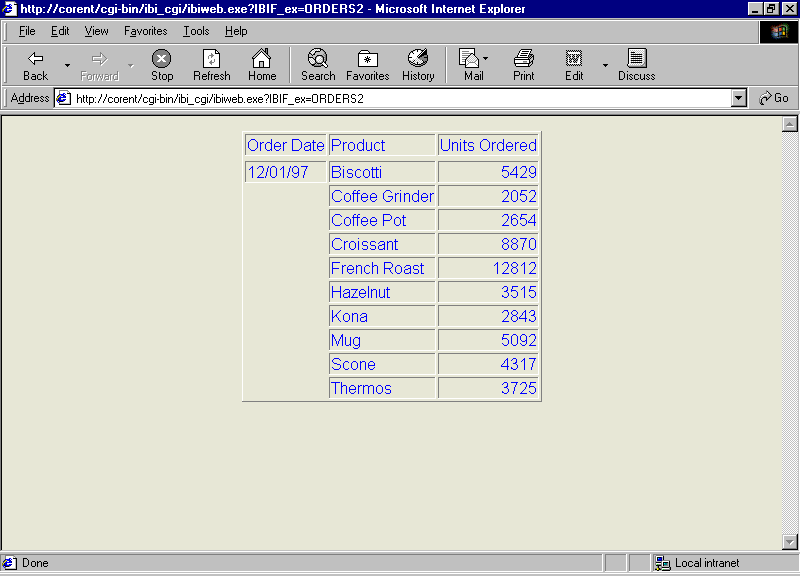 SET PAGE-NUM = OFF TABLE FILE GGORDER SUM QUANTITY AS 'Units Ordered' BY HIGHEST 1 ORDER_DATE AS 'Order Date' BY PRODUCT_DESCRIPTION a. ON TABLE HOLD FORMAT HTMTABLE AS ORDERS END b. -HTMLFORM RPTPG
