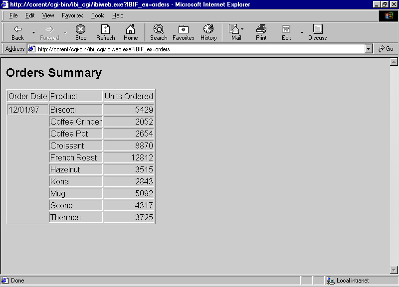 <HTML> <BODY> <A HREF="/ibi_apps/WFServlet?IBIF_ex=orders2">Click here for the Orders Summary report.</A> </BODY> </HTML>
