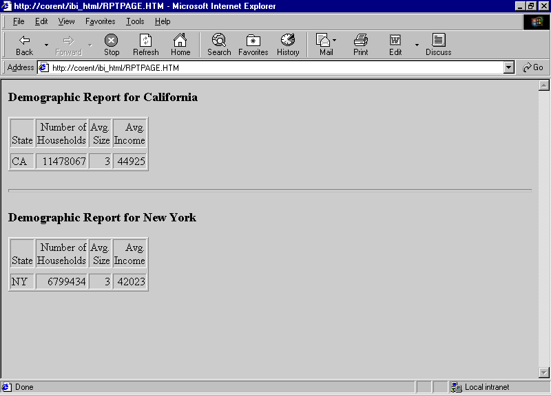 a. FILEDEF RPTPAGE DISK APPDIR\RPTPAGE.HTM SET PAGE-NUM = OFF TABLE FILE GGDEMOG SUM HH AS 'Number of,Households' AVGHHSZ98 AS 'Avg.,Size' MEDHHI98 AS 'Avg.,Income' BY ST WHERE ST EQ 'CA' b. ON TABLE HOLD FORMAT HTMTABLE AS UPPER END TABLE FILE GGDEMOG SUM HH AS 'Number of,Households' AVGHHSZ98 AS 'Avg.,Size' MEDHHI98 AS 'Avg.,Income' BY ST WHERE ST EQ 'NY' c. ON TABLE HOLD FORMAT HTMTABLE AS LOWER END -RUN d. -HTMLFORM RPTOUT SAVE AS RPTPAGE