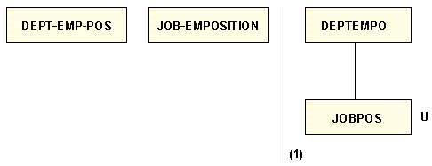 For example, in the diagram below, the LRF record DEPT-EMP-POS is represented as the root segment DEPTEMPO; the LRF record JOB-EMPOSITION as the unique segment JOBPOS. The related fields are POS_STRT_DR2 (the IXFLD value) and POS_STRT_DT1 (the KEYFLD value).