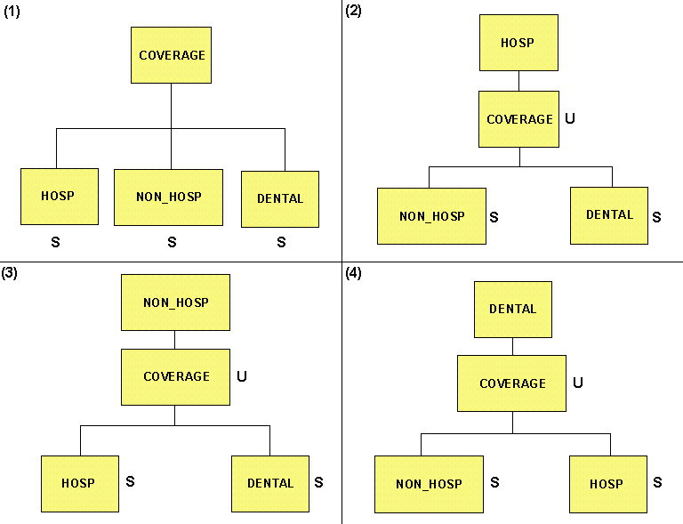 For example, to describe the COVERAGE record type and its three members of the COVERAGE-CLAIMS set, you may choose one of four ways as depicted in the following diagram: