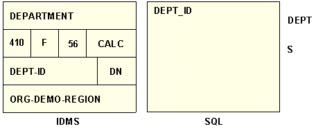 The following diagram illustrates how a record type is described as a segment. The record type DEPARTMENT contains the field-type DEPT-ID. Its corresponding server segment DEPT contains a field named DEPT_ID.