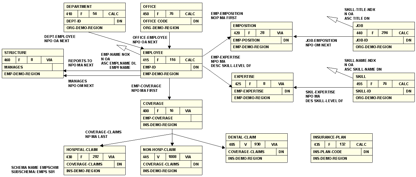 The IDMS/DB representation of record types and set relationships within a database is called a Bachman diagram, also known as a data structure diagram. In a Bachman diagram, a record type is depicted as a box; a set, as a line with an arrow. Set names appear as labels beside the arrows. The box that the arrow points to is the member record type. Triangles indicate indexes. The next diagram is the Bachman diagram for the IDMS/DB network subschema EMPSS01. Sections of this diagram are referenced throughout these sections.