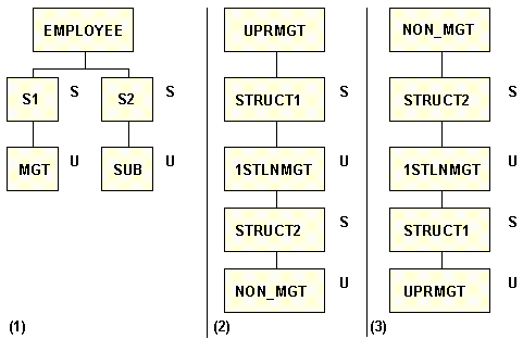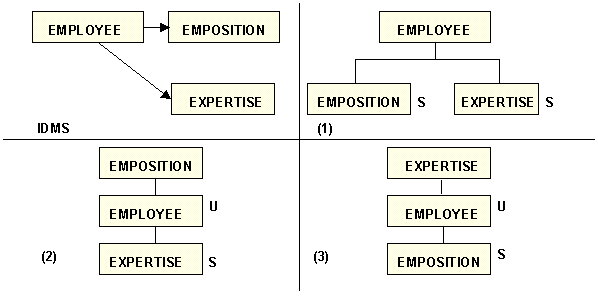 For example, the diagram below depicts three ways to describe the EMPLOYEE, EXPERTISE, and EMPOSITION structure in one Master File: