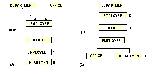 When an IDMS/DB record type is a member of two or more sets, the association of the owner record type as the parent segment must be abandoned for one or more sets, because a segment can have only one parent. The diagram below displays the possible interpretations for this IDMS/DB configuration.