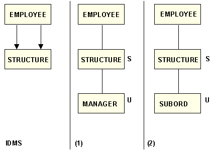 In the following diagram, the EMPLOYEE and STRUCTURE record types are connected by two sets. This simple bill-of-materials structure can be described two ways: