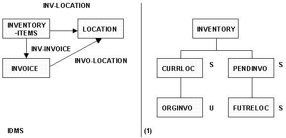This figure also illustrates a second principle: an IDMS/DB structure can have more than one representation as a hierarchy. The type of parent/descendant relationship required in the Master File depends on whether the owner or the member record type is designated as the parent segment.