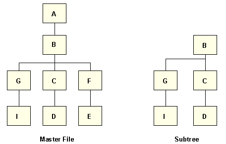 To retrieve records for a request, the server first constructs a smaller subtree structure from the structure defined by the Master File. The subtree consists of segments that contain fields named explicitly in the request and those named implicitly by DBA DEFINE or COMPUTE statements. The subtree also includes any segments needed to connect these segments.