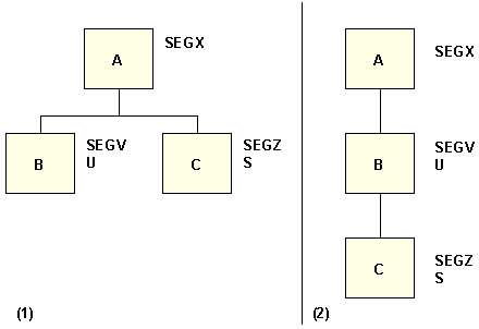 For instance, panel 1 of the following diagram shows two descendant segments. The statement SELECT B ORDER BY C is invalid, because the segments containing fields B and C do not lie on the same path. However, if the segment containing B is a unique segment, the two segments do lie on the same path. Panel 2 shows the retrieval view. The statement SELECT B ORDER BY C is valid.