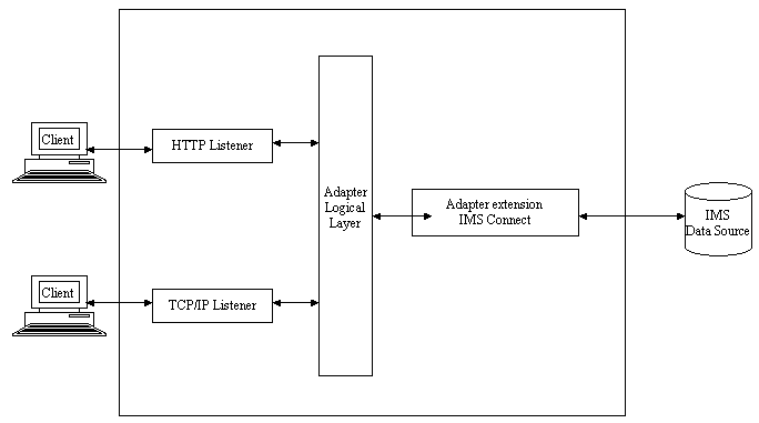 This diagram illustrates how the client application communicates with the Application Adapter Server using the TCP/IP or HTTP protocol. The communication to the IMS region uses IMS Connect.
