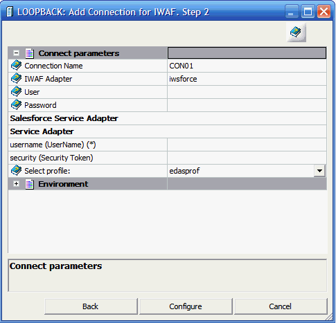For example, the following illustration shows the connection parameters dialogue for a Salesforce.com service adapter.