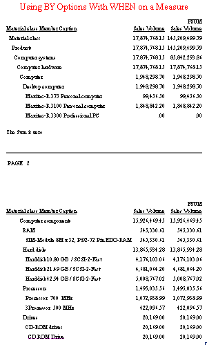 The first phase selects hierarchy members to display. The hierarchical reporting phrase BY or ON HIERARCHY automatically sorts and formats a hierarchy with appropriate indentations that show the parent/child relationships. If you do not want to see the entire hierarchy, you can use the WHEN phrase to select hierarchy members for display. The expression in this WHEN phrase must reference only hierarchy fields, not dimension properties or measures.