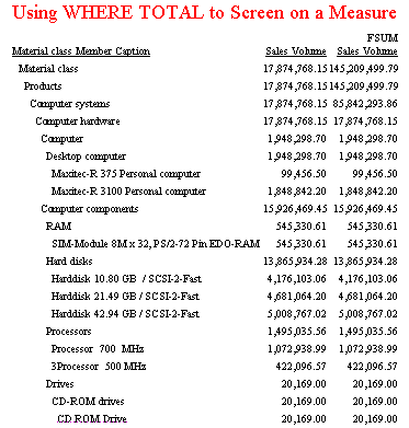 Measures, being summarized values, can be referenced in WHERE TOTAL tests and COMPUTE commands because those commands are processed after the hierarchy selection and aggregation phases of the request. When screening with WHERE TOTAL, the aggregation phase of the report processing is over, so totals on the report are not recalculated to account for the data that is screened out, the rows are just removed.