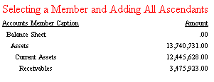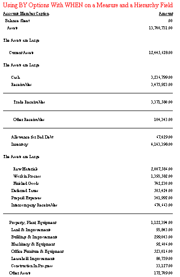 The exact set to which the VISUALTOTALS function is applied consists of the members selected by WHEN and SHOW clauses plus connecting members. WHEN and SHOW clauses may select one or more pairs of members one of which is an ancestor of another but not the members in between (Assets and Cash in the following output). The adapter adds all intermediate members connecting these two members to the set to which the VISUALTOTALS function is applied. This is done to ensure its proper functioning. Members below or above this connected set are not added: