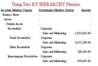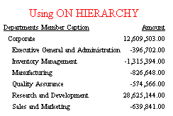The first phase selects hierarchy members to display. The hierarchical reporting phrase BY or ON HIERARCHY automatically sorts and formats a hierarchy with appropriate indentations that show the parent/child relationships. If you do not want to see the entire hierarchy, you can use the WHEN phrase to select hierarchy members for display. The expression in this WHEN phrase must reference only hierarchy fields, not dimension properties or measures.