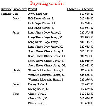 {[Australia], [United States]} on Axis(1) From [Adventure Works]The report has the following contents, where the values of the measure Internet Sales Amount are extracted for members Australia and United States as they are rolled up in the cube, not just for the cities selected by the WHERE criteria. This is the default adapter behavior: