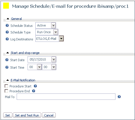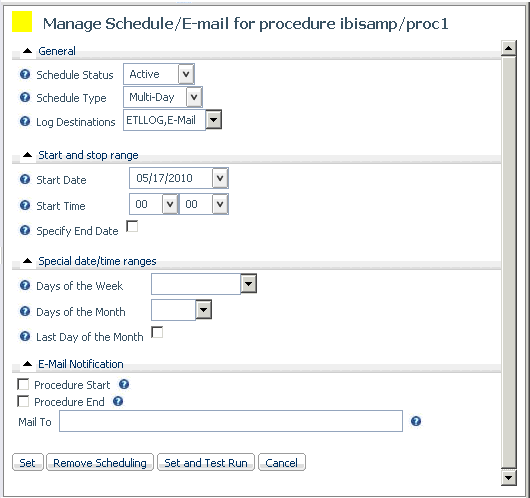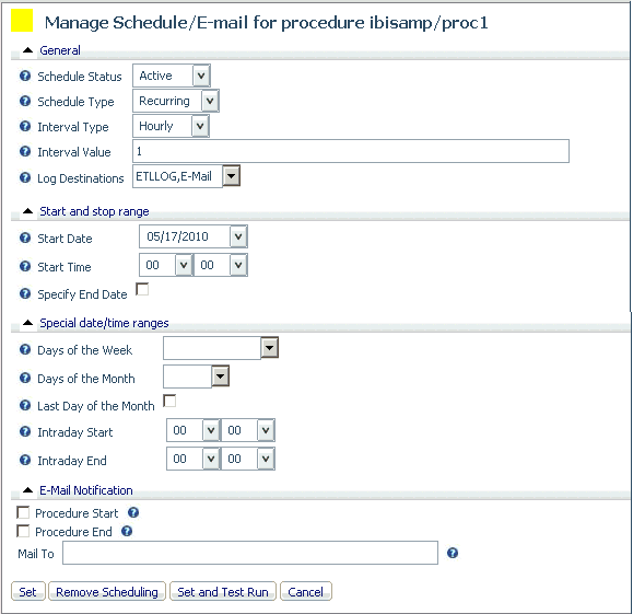 You can control when and how often a procedure is run using the Schedule/E-mail option on the navigation pane of the Applications page.