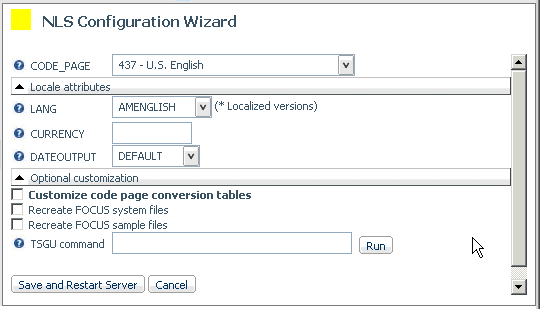 Complete the configuration, then click Save and Restart Server. The server creates the necessary transcoding, sorting, and monocasing tables for the selected code page.