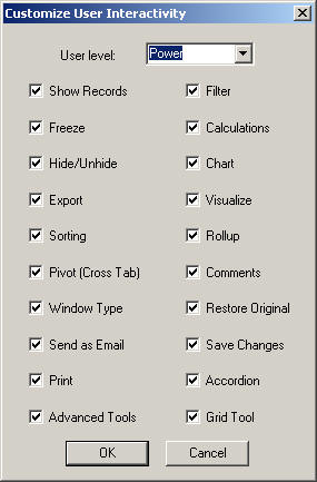 If you select a combination of options that does not match one of the existing user types (Power user, Analytical user, or Business user), the User level name that appears in the Customize User Interactivity dialog box is Custom user. This is not a default user type or a selectable user type. It is used to show that options for this user do not match any of the existing user types.