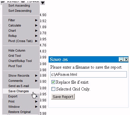 You can save an active report from your browser to another location. You can e-mail active reports as an HTML attachment. You can also export data in an active report to HTML, CSV (comma delimited), or XML (Excel) formats. You can export the entire data set or only filtered records. Export does not include the JavaScript that makes interaction possible due to browser security settings, only static data is exported. All data that you see in your report is exported. For example, if you have applied calculations to a column, those calculations appear in the exported data. In addition to exporting data, you may also export charts created in active reports to Microsoft® Excel®, Word, and PowerPoint®.
