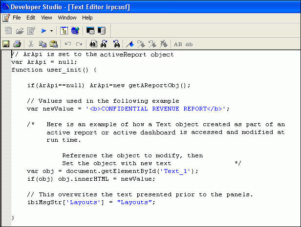 The following image shows the contents of a sample irpcusf.js file in the Developer Studio Text Editor.